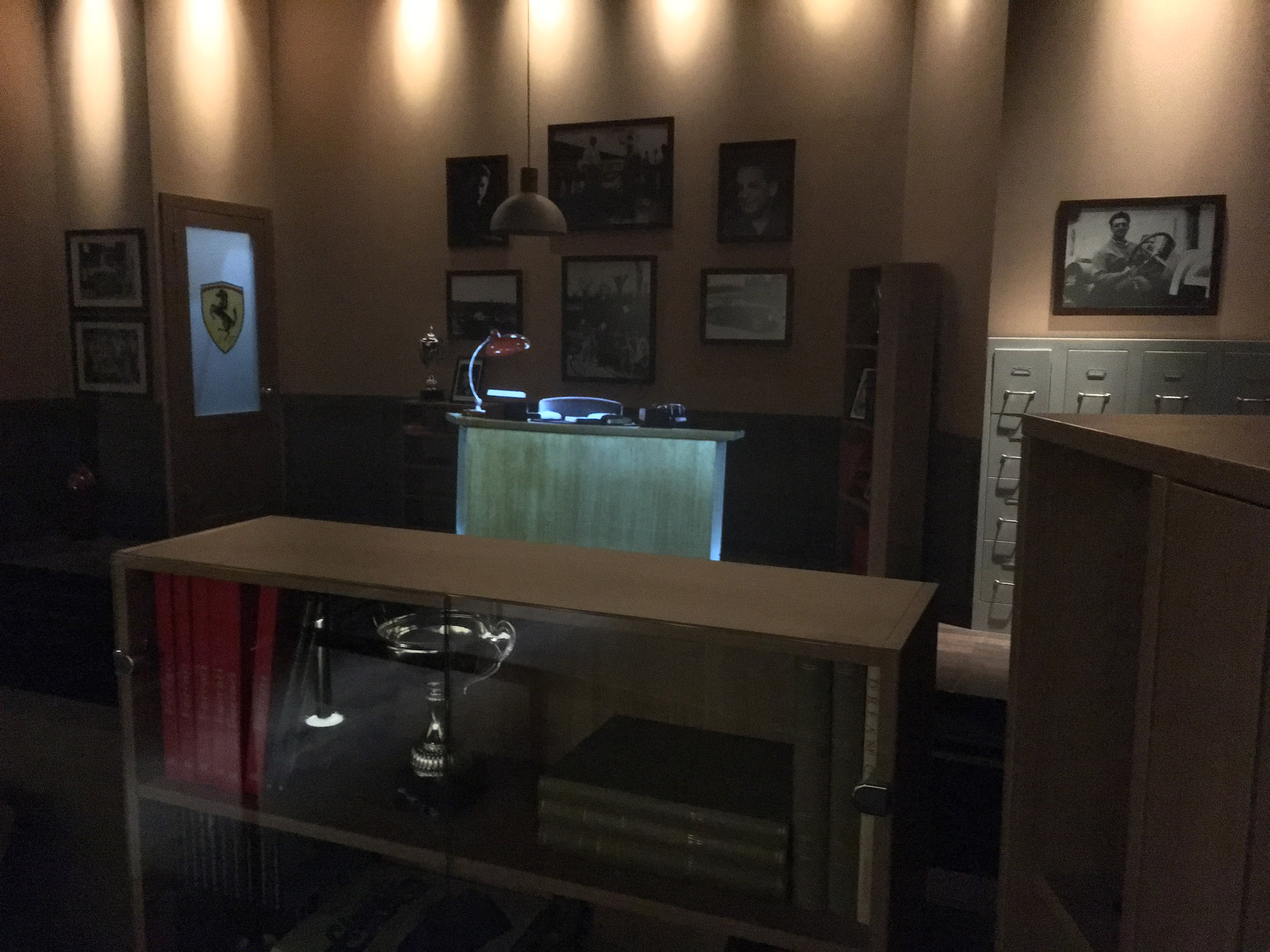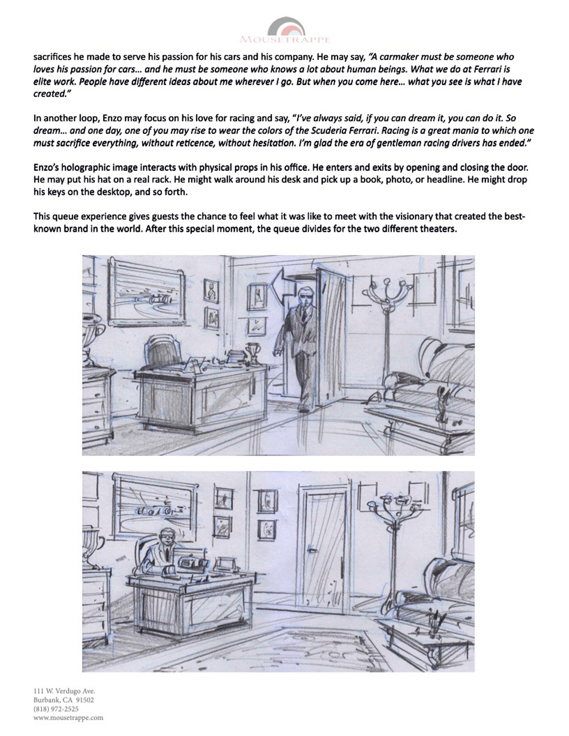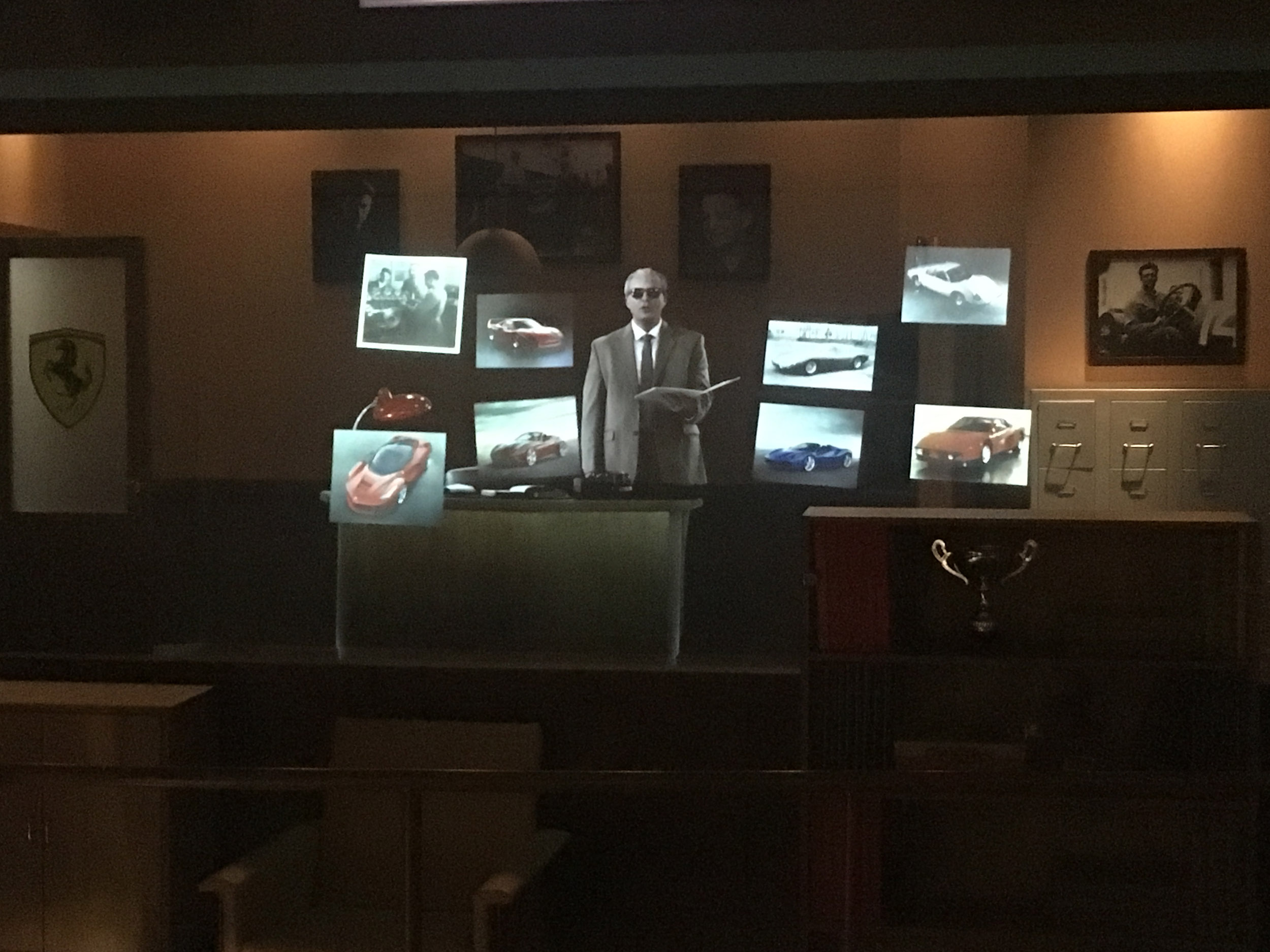 Guests would then move into a themed version of Enzo Ferrari's own office wherein Enzo greeted guests and espoused Ferrari's legendary accomplishments and philosophies. Historical photos and drawings "magically" flew off his desk and out of his file cabinets (show action + pepper's ghost projections). Following this presentation guests (who remained separated in the office) continue into their respective queues.