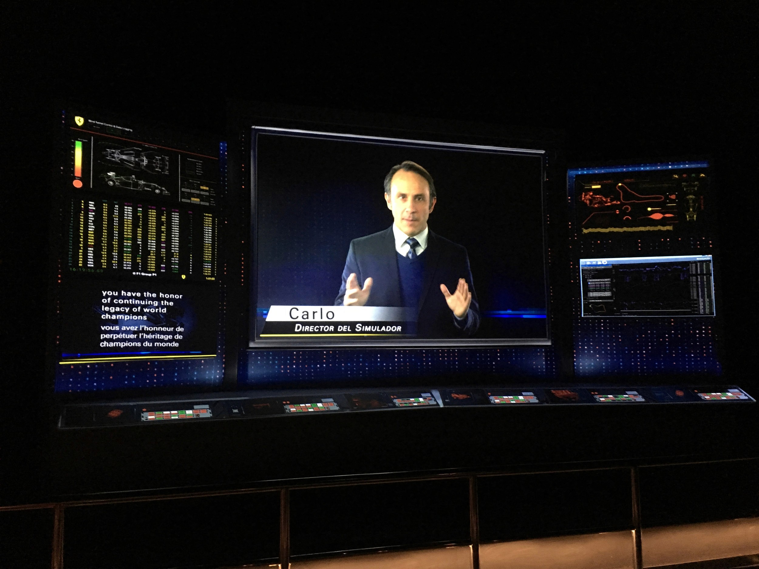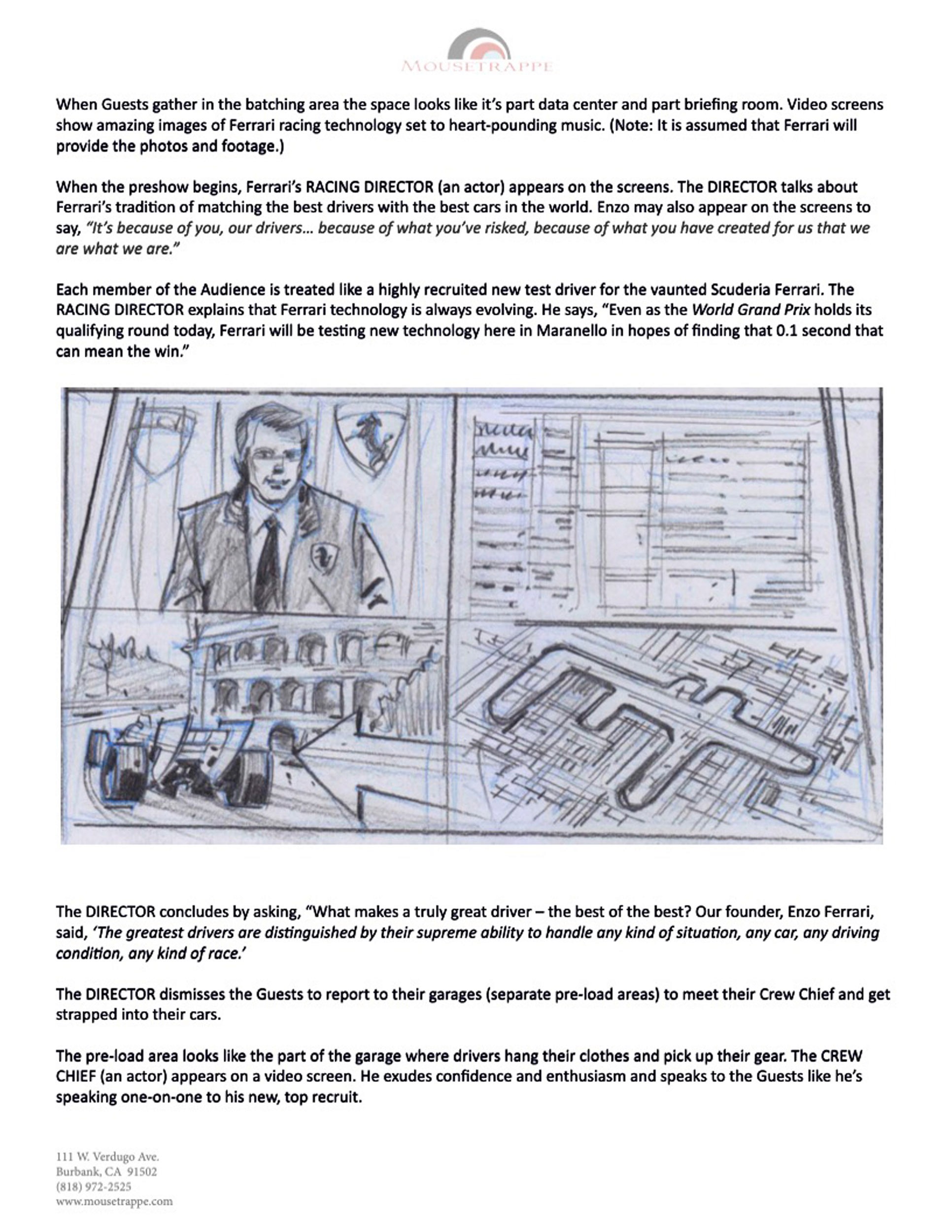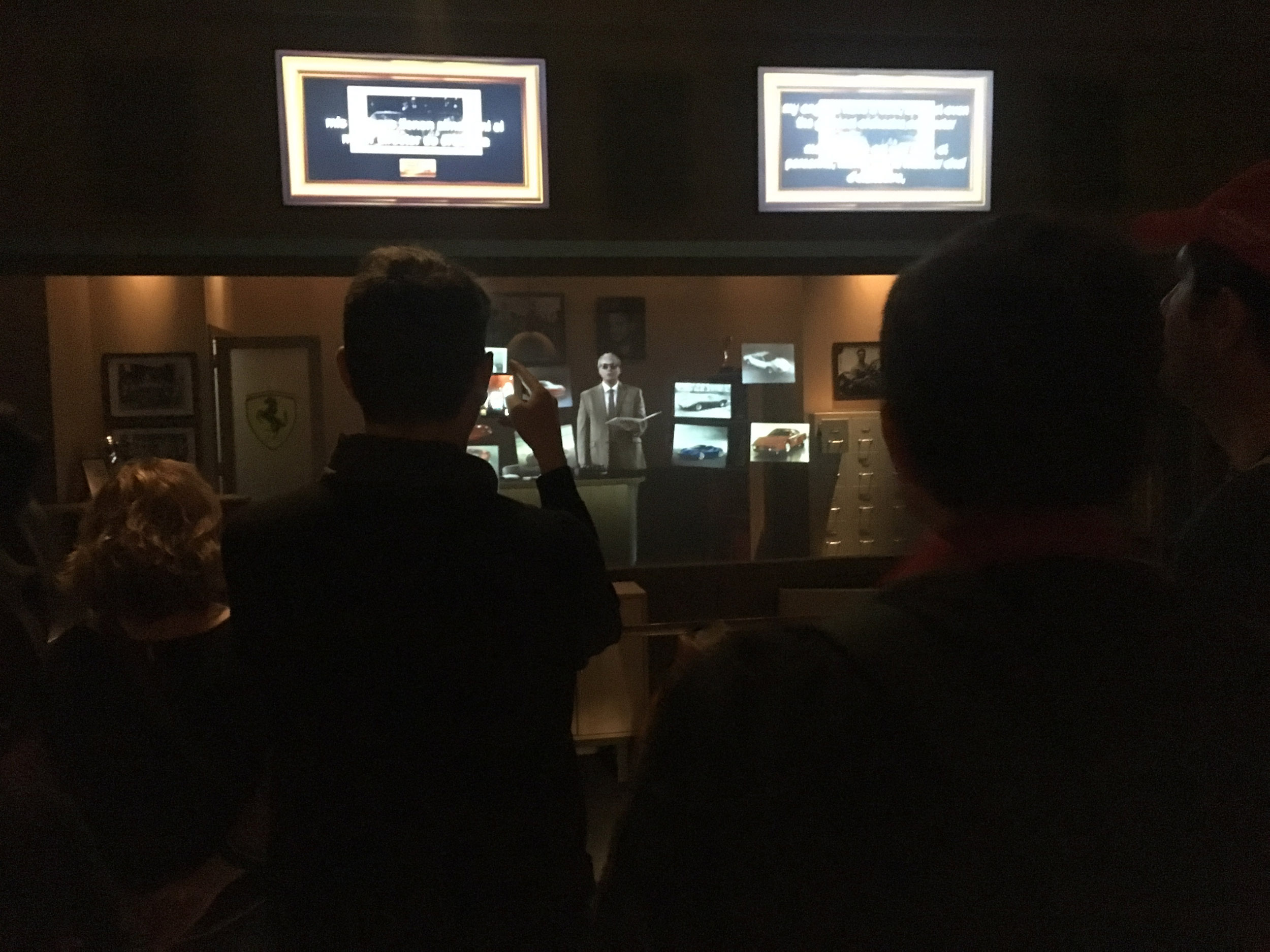 Guests would then move into a themed version of Enzo Ferrari's own office wherein Enzo greeted guests and espoused Ferrari's legendary accomplishments and philosophies. Historical photos and drawings "magically" flew off his desk and out of his file cabinets (show action + pepper's ghost projections). Following this presentation guests (who remained separated in the office) continue into their respective queues.