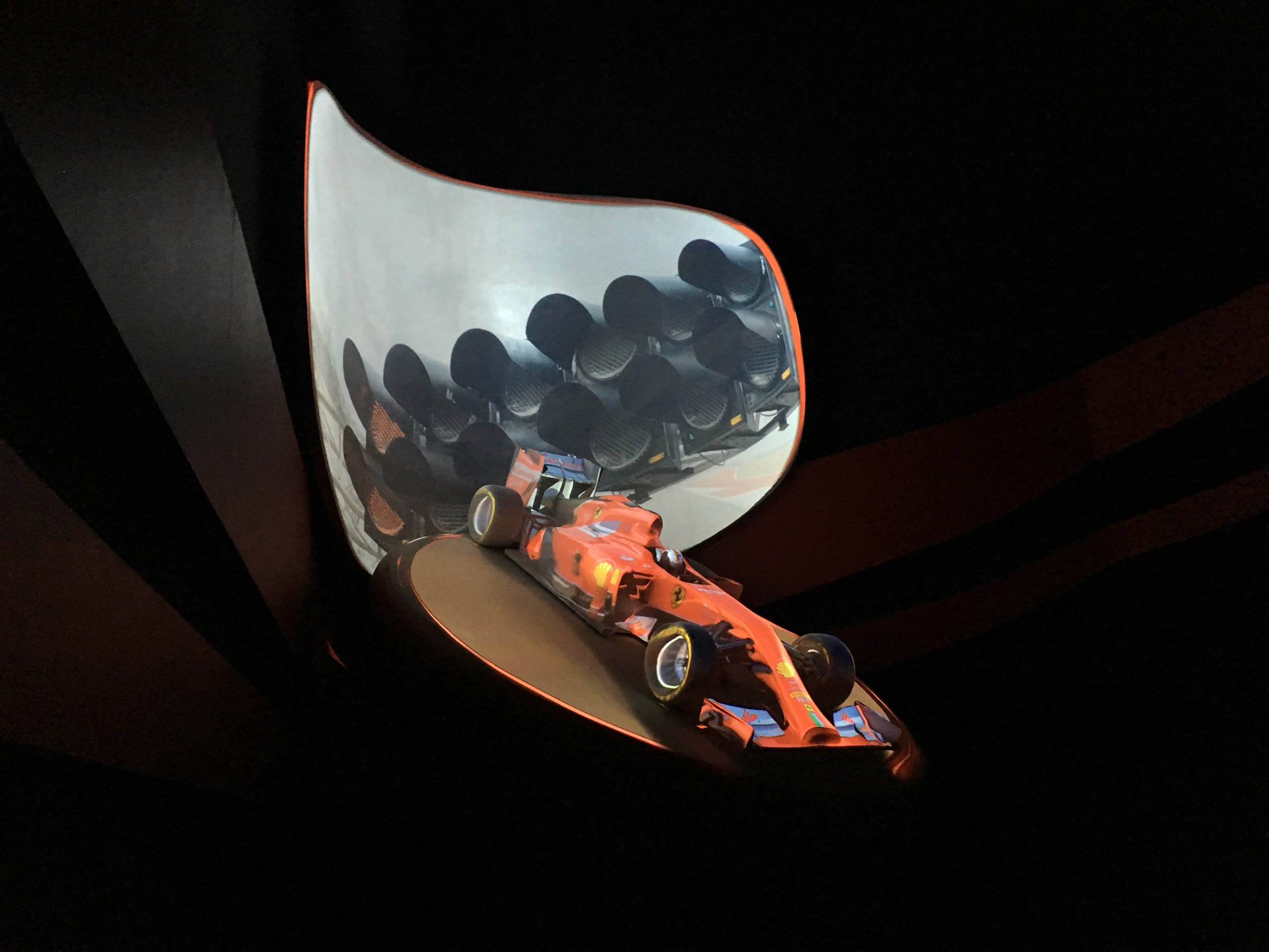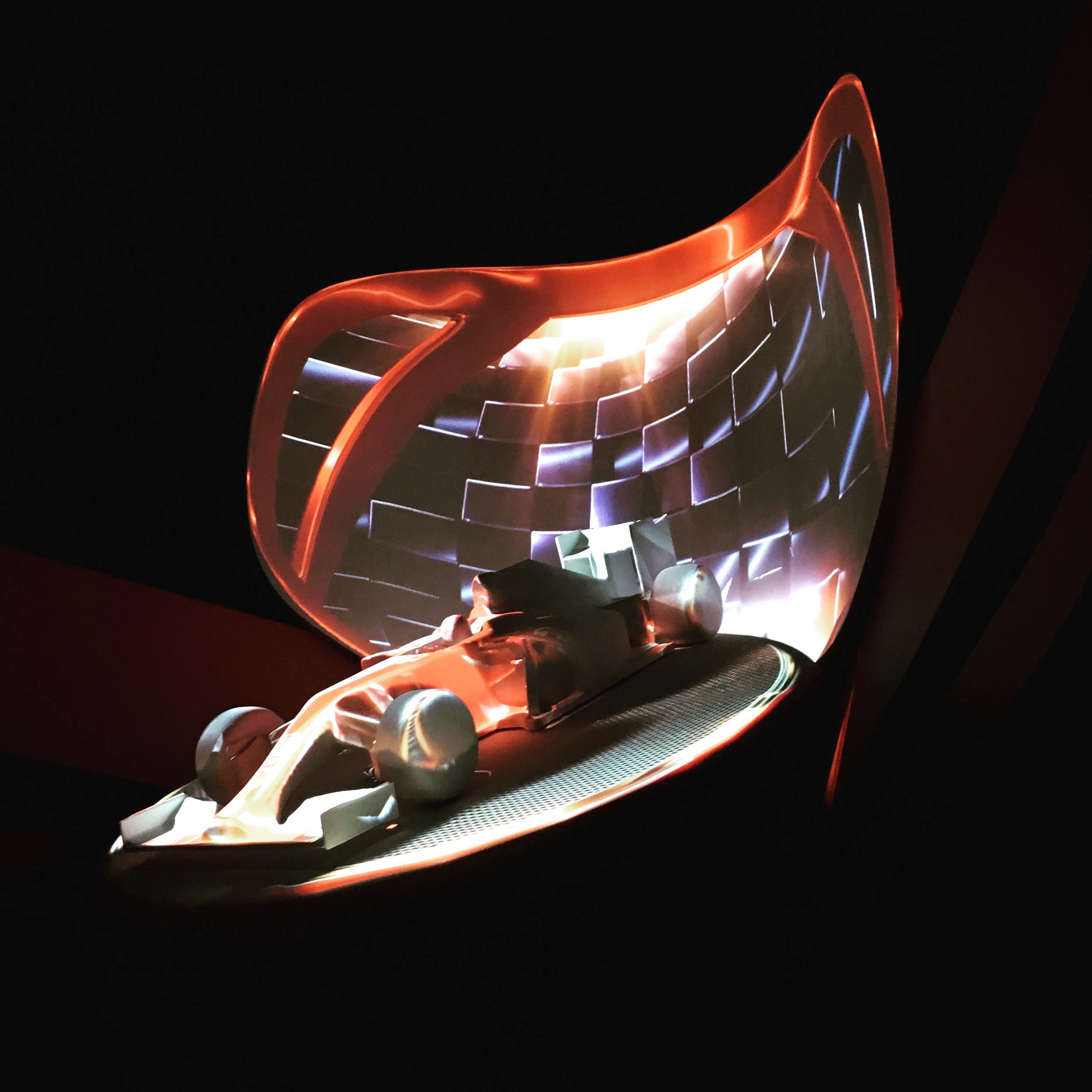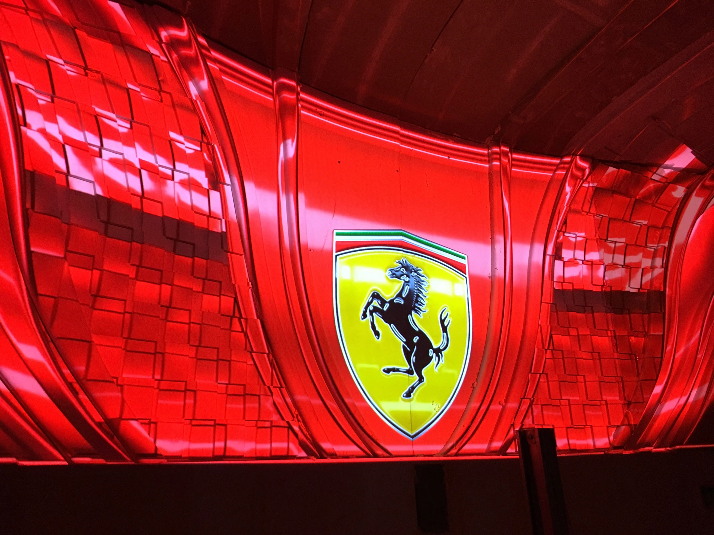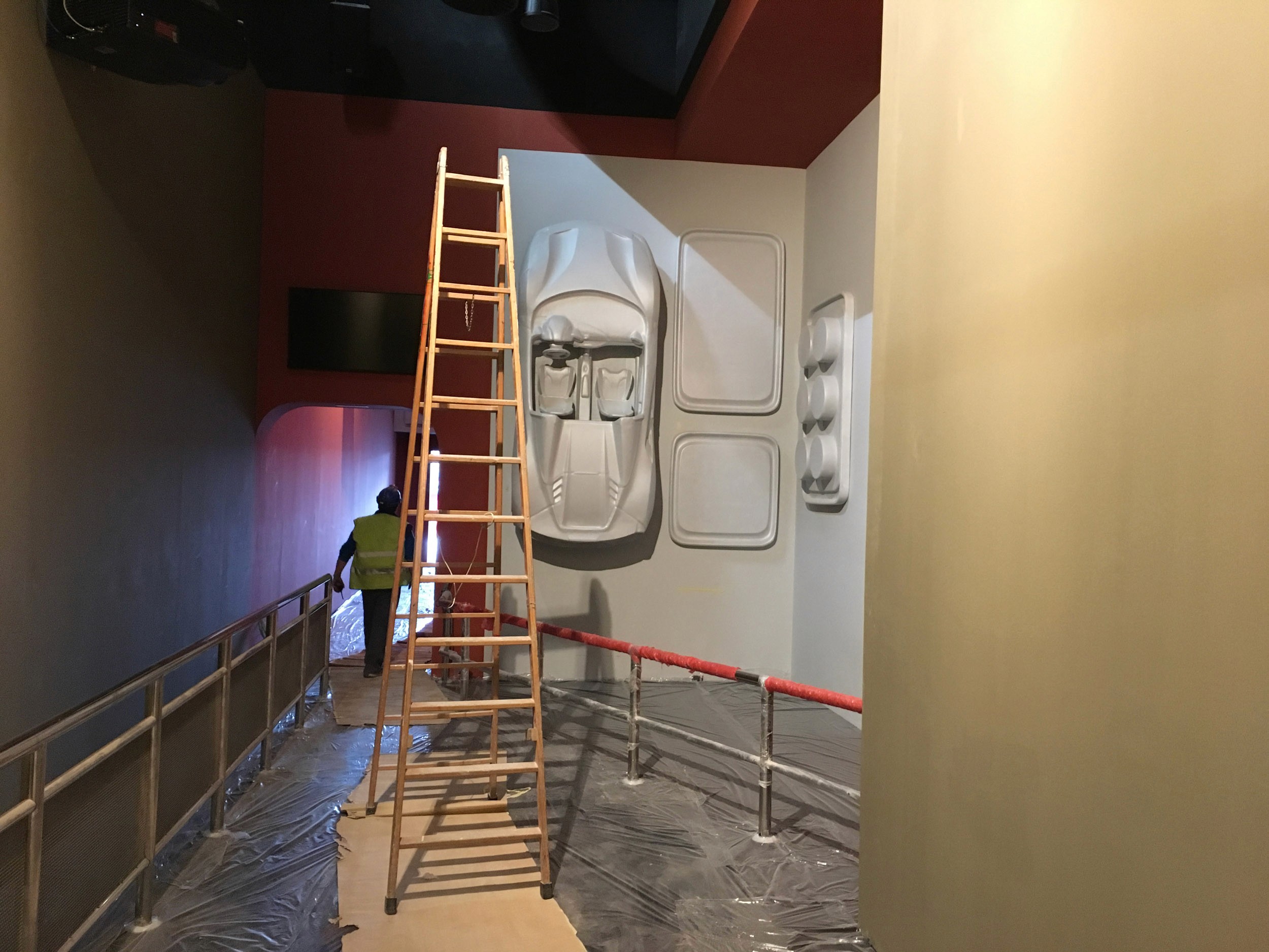 The direction was to not overly "theme" the space as the rest of the land provided plenty of Italian and Ferrari environments, but rather to create dynamic storytelling through a combination of scenic and video projections. For the extended queue we created a massive 35' tall by 90' wide bas relief filled with projection mapping and a 30 minute loop celebrating everything Ferrari. The centerpiece was flanked by projection-mapped Ferrari's - a road car on the flying theater entrance side and an F1 car for the other.