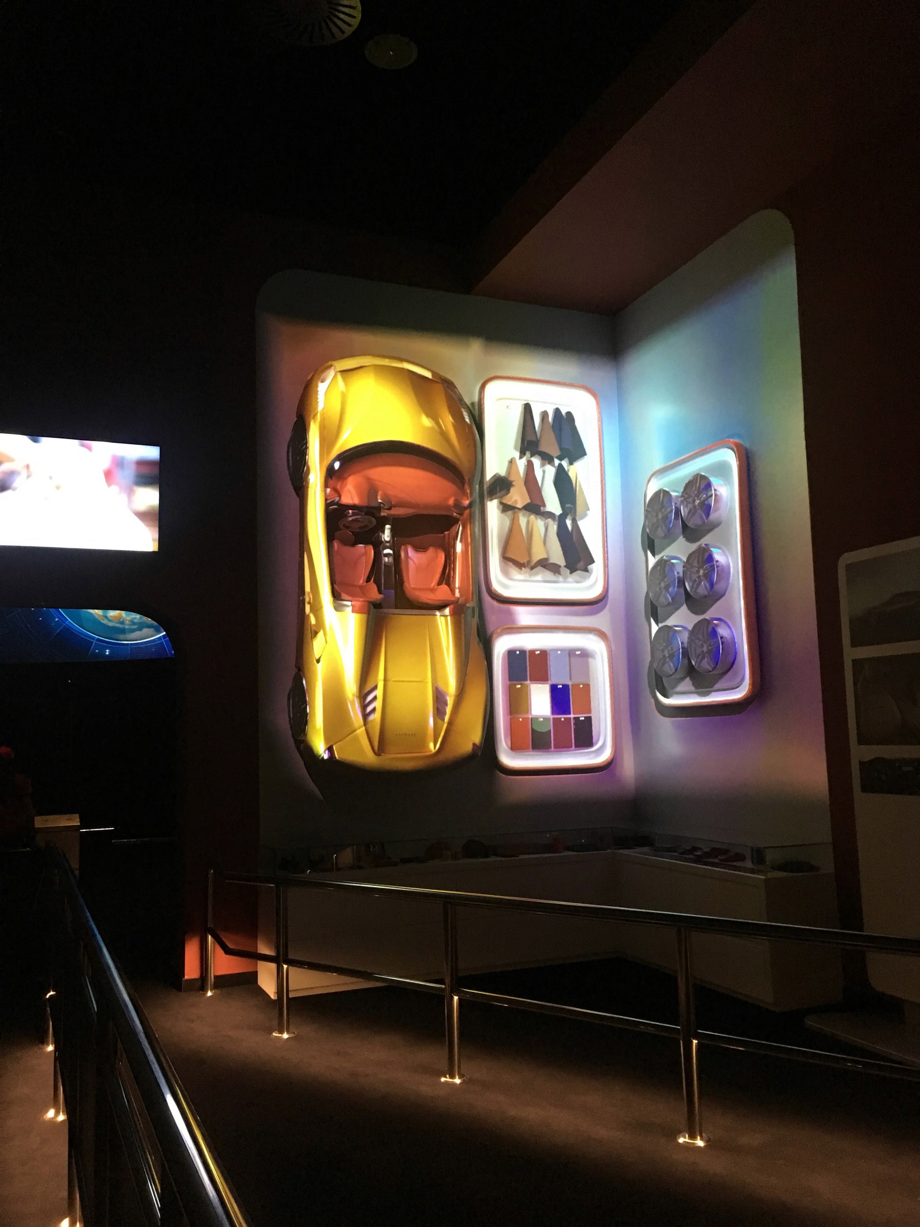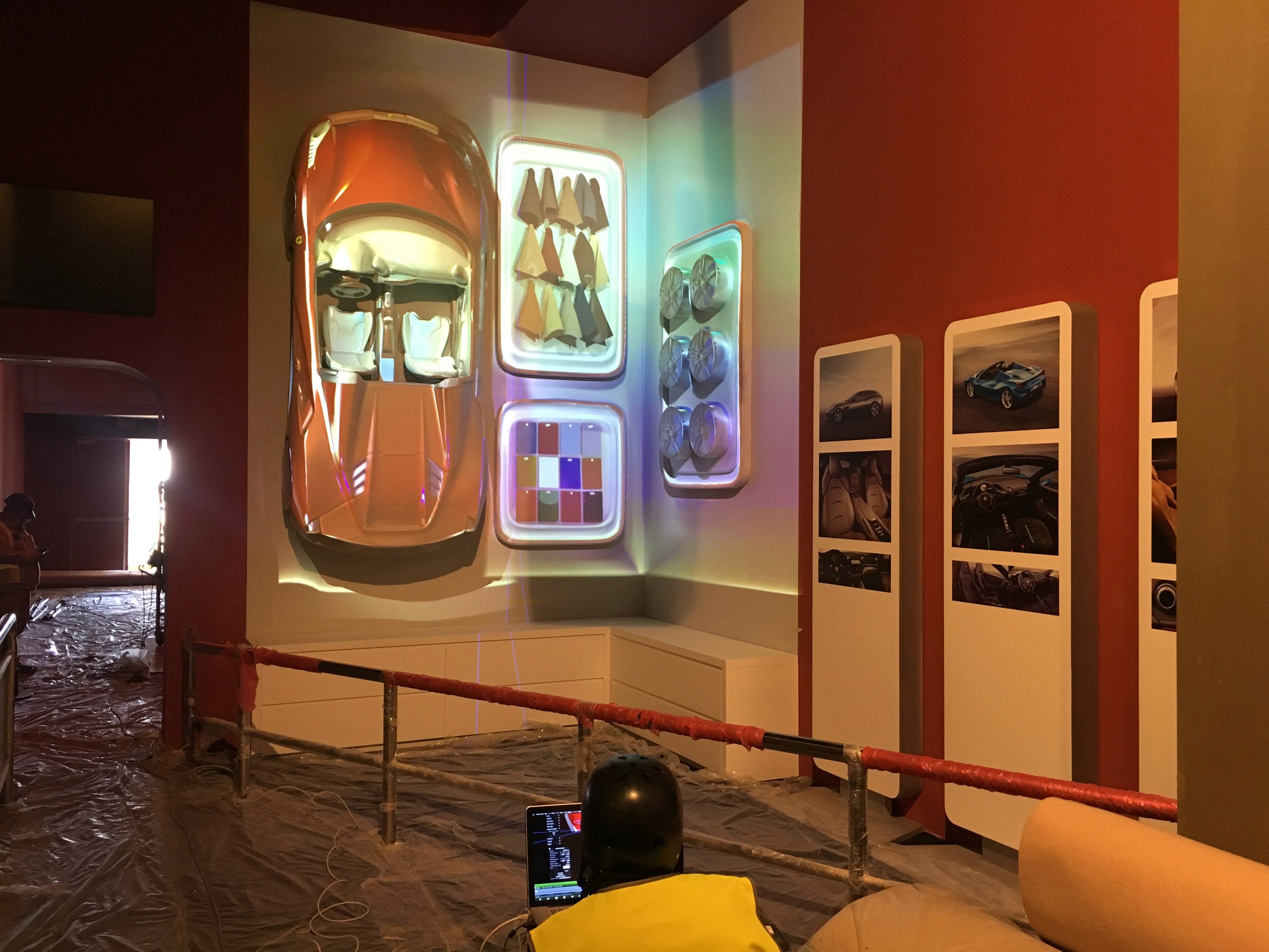 Flying Dreams passengers visited a design studio where they viewed a Ferrari road car and all of its design options from paint colors to upholstery, all of which would transform the car through projection mapping. A dimensional globe appeared to rotate an highlight their upcoming destinations during the ride, and in the pre-show 3 of the classic travel posters suddenly come alive and set up the story and deliver safety information.